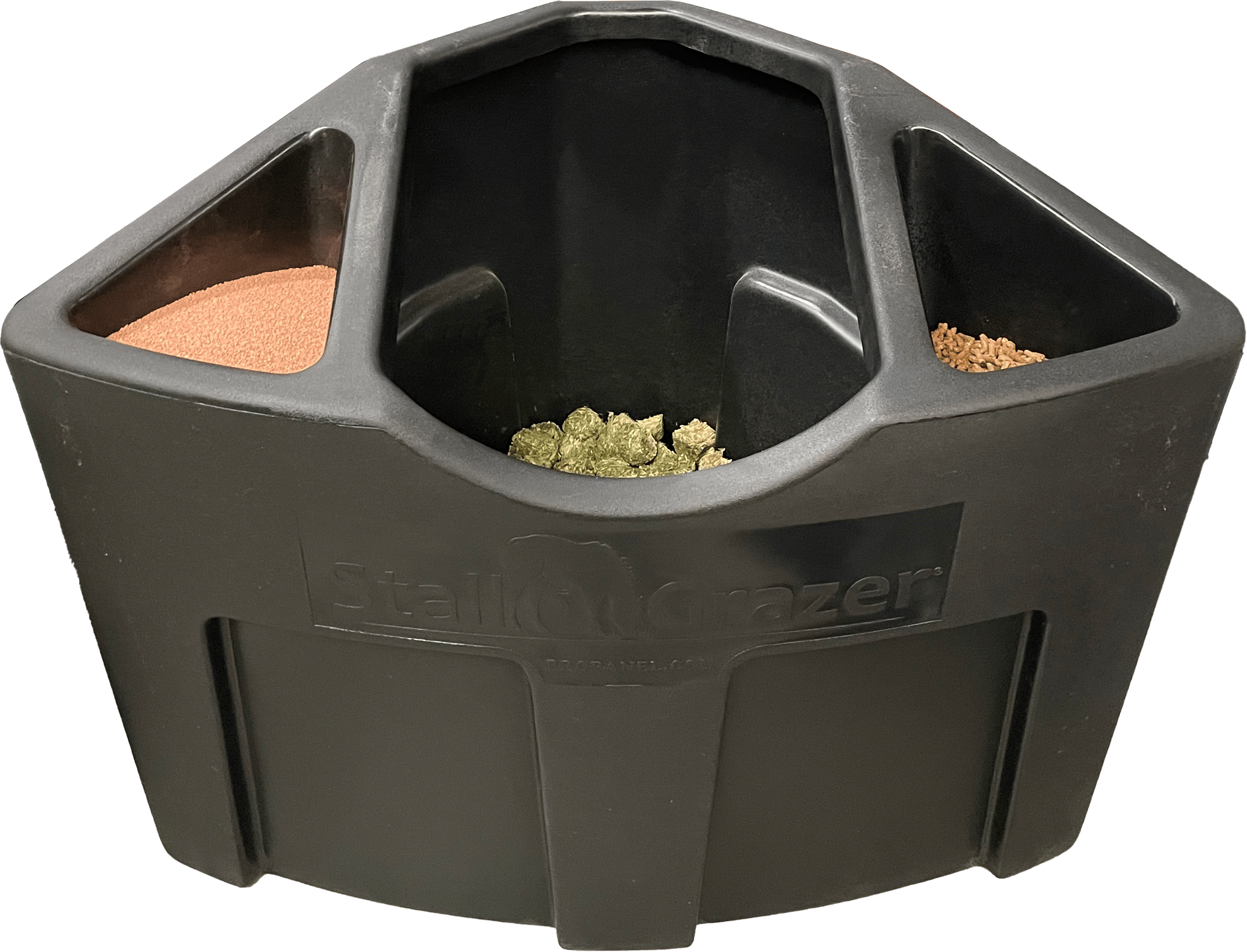 The Stall Grazer Small Animal feeder is designed for small animals such as goats, sheep or ponies. The feeder is a one piece molded polymer design that has a center cavity for hay and a smaller cavity on each side for grain and salt.